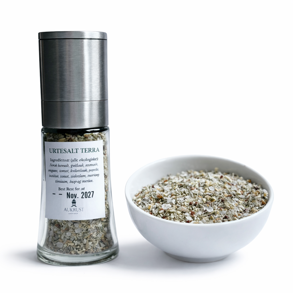 Norsk havsalt, kvitlauk, rosmarin, oregano, tomat, sjalottlauk, paprika, salvie, basilikum, isop og merian.